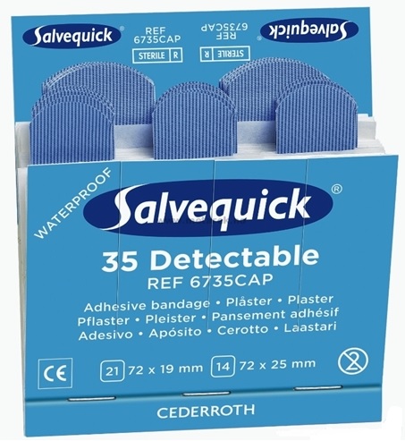 Salvequick Blue Detectable plåster är särskilt avsedda för användning inom livsmedelsindustrin. Plåstren är detekterbara och upptäcks av de flesta metalldetektorer. Den blå färgen gör att plåstren också är lätta att upptäcka visuellt.