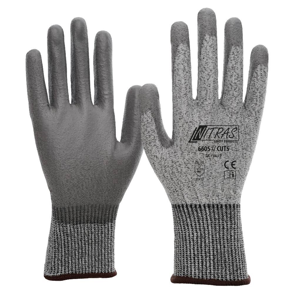 Skärskyddshandske av specialtyg med tunn beläggning av grå Polyuretan i handflatan och på fingertopparna