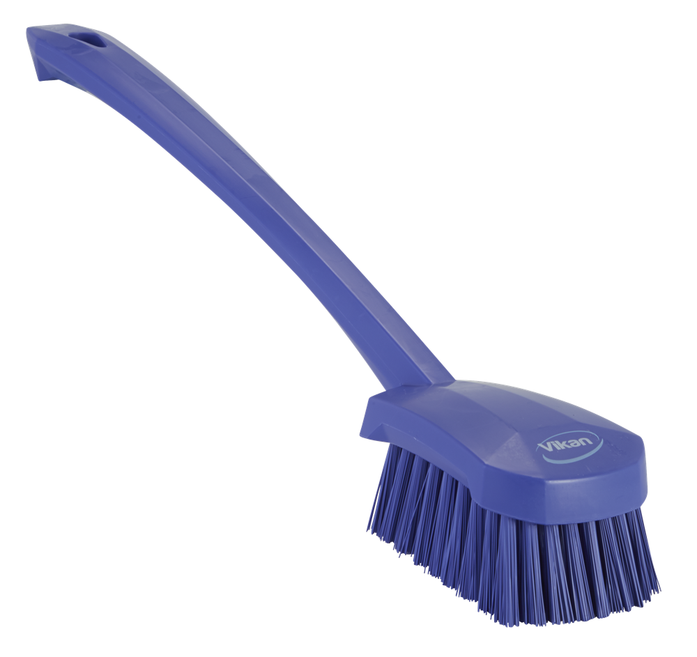 Det långa skaftet på denna borste gör det möjligt att komma åt på svåråtkomliga ytor. De vinklade hårda filamenten fungerar bra för rengöring på avstånd, t ex på rengöringsmaskinger, i hinkar, baljor och annan utrustning där det krävs längre räckvidd.