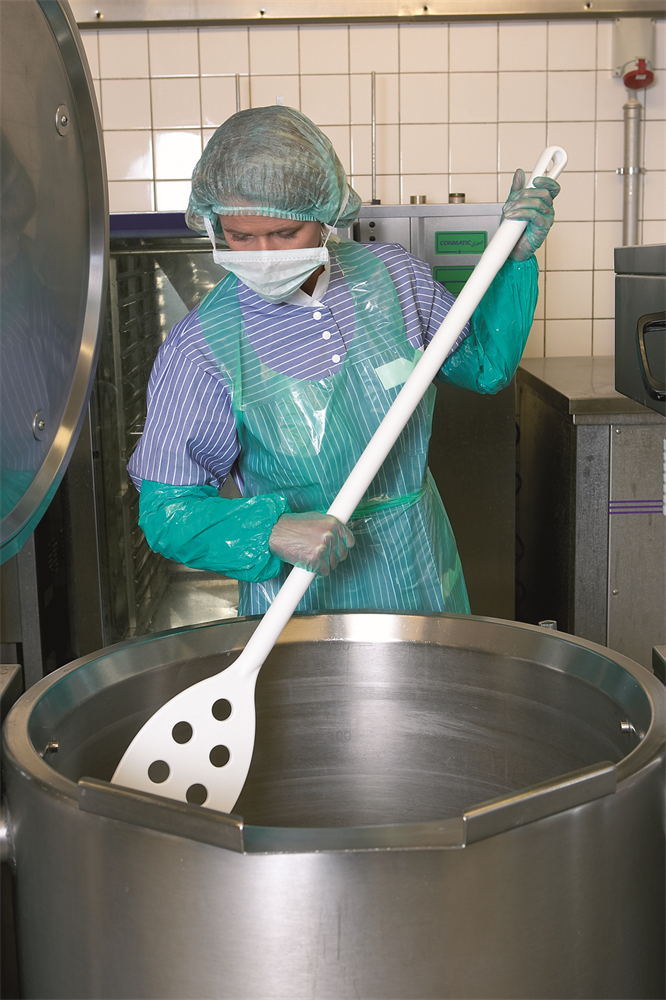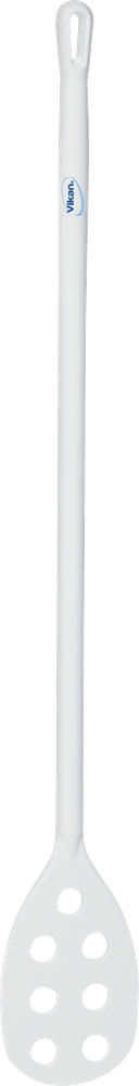 Omrörare med långt skaft och hål i det lilla bladet. Användes för omrörning av produkter och vid tillagning. Hålen i bladet gör omrörningen enklare