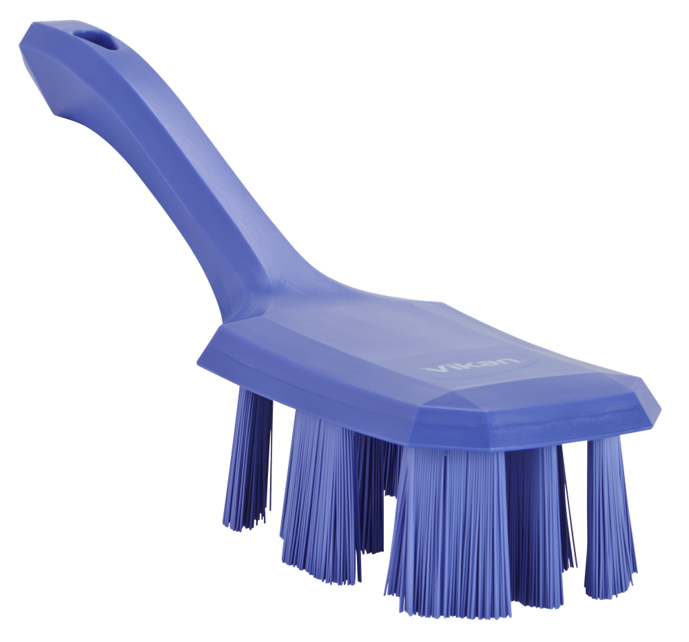 ULTRA SAFE TECHNOLOGY kortskaftad handborste med vinklade filament, för maximal hygien vid rengöring av transportband, produktionslinjer, maskiner och livsmedelsytor i hygienområden. Den vinklade och cirkulära utformningen av filamenten säkerställer effektiv rengöring.