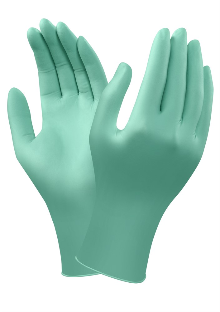 - NeoTouch®-handskar har en innerbeläggning av polyuretan, vilket gör att de lätt kan tas på och av. Ett greppmönster på fingertopparna garanterar ett säkert torr- och våtgrepp. En rullad krage gör att handsken håller sig på plats och den gröna färgen ger en lätt identifiering.
