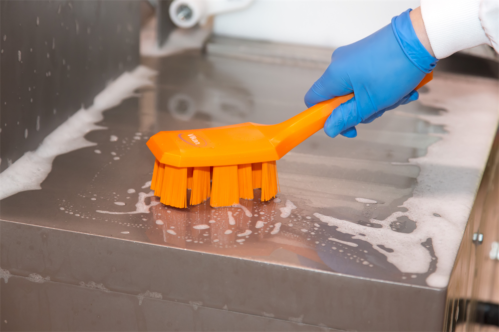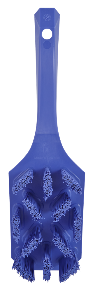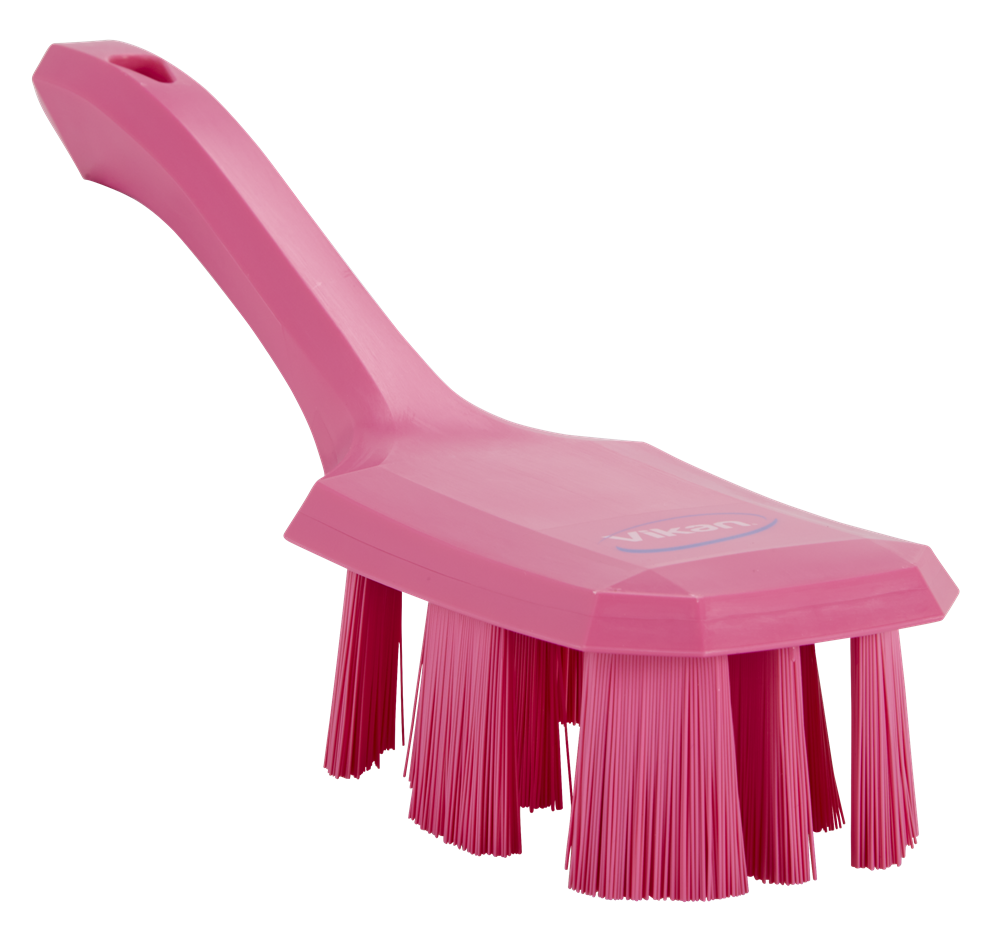 ULTRA SAFE TECHNOLOGY kortskaftad handborste med vinklade filament, för maximal hygien vid rengöring av transportband, produktionslinjer, maskiner och livsmedelsytor i hygienområden. Den vinklade och cirkulära utformningen av filamenten säkerställer effektiv rengöring.